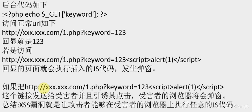 (1)非持久型跨站:即反射型跨站脚本漏洞,是目前最普遍的跨站类型。跨站代码一般存在于链接中,请求这样的链接时,跨站代码经过服务端反射回来,这类跨站的代码不存储到服务端(比如数据库中)。