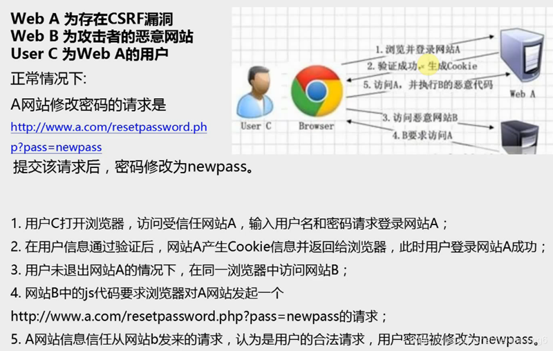 跨站请求伪造(Cross-site request forgery , CSRF),是一种常见的web安全漏洞,由于在web请求中重要操作的所有参数可被猜测到,攻击者可通过一些技术手段欺骗用户的浏览器去访问一个用户曾经认证过的网站,遂使攻击者可冒用用户的身份,进行恶意操作。