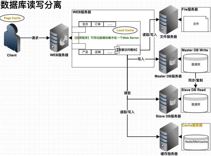 技术点:数据库主从同步部署,扩展数据访问模块,实现读写分离;