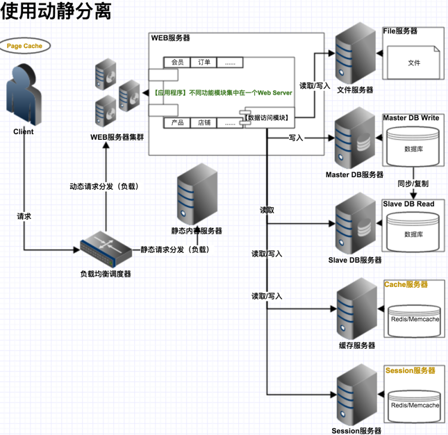 2.再大一点,考虑到数据库服务器和应用服务器的分离,每个服务器都设置好了,可以再增加一个服务器,把静态请求和动态请求分开;