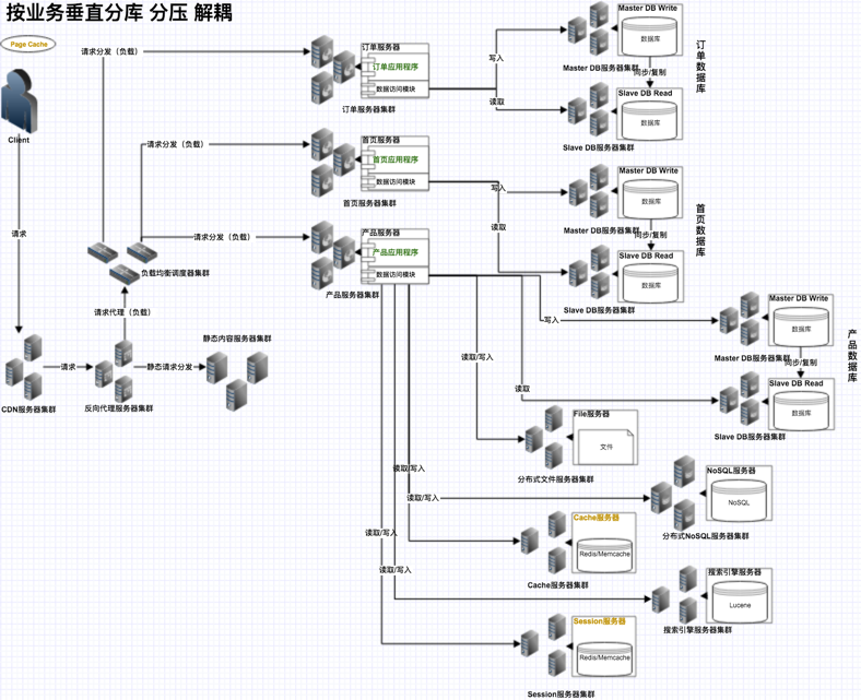 通过分而治之的手段将整个网站业务分成不同的产品线,如首页、商铺、订单、卖家、买家等拆分成不同的产品线,分归不同的业务团队负责。各个应用之间可以通过建立一个超链接建立关系,也可以通过消息队列进行数据分发。