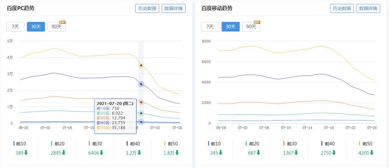 如下图所示,该站点的关键词排名在7月20日当天就明显开始下跌: