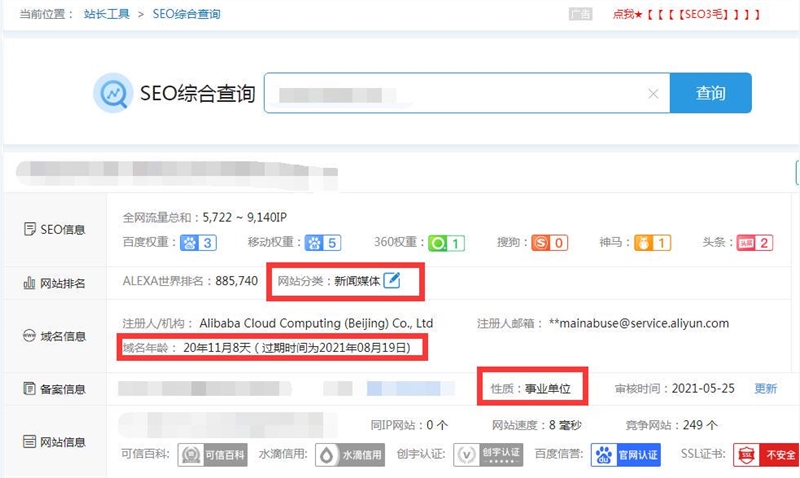 百度提供的案例站点就是属于这种类型,该站点作为新闻媒体网站域名年龄超过20年,而且性质属于事业单位。