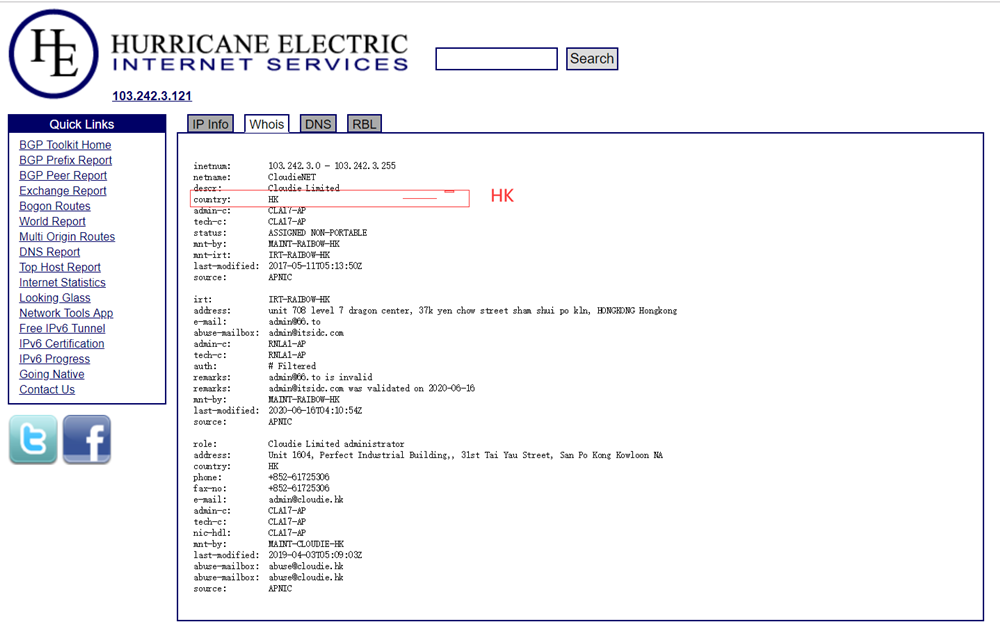 自己的VPS,肯定都知道机房位置的,所以我们要做的就是看下这个IP的Whois信息中的地区/国家与你机房的位置是否一致。