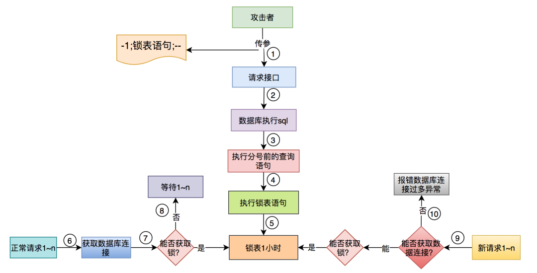攻击者 sql 注入了类似这样的参数:-1;锁表语句–。
