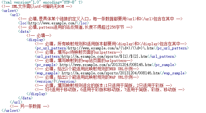 提交格式:支持以xml文件提交移动适配数据。xml文件可提交url一对一对应关系以及url pattern级对应关系,提交数据可以是1组或者多组。一个xml文件提交的数据上限是1000组.