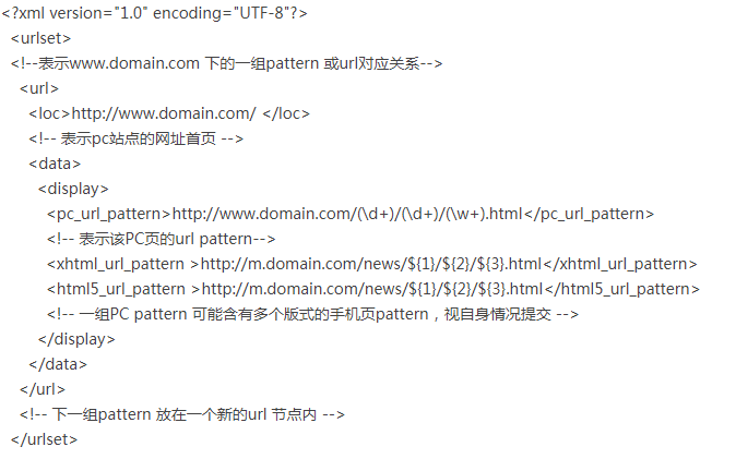 规则适配:如果你的网站PC端页面与移动页面存在规则(pattern)的匹配关系,如PC页面www.xxx.com/1.html对于的移动页面是m.xxx/1.html时,就可以通过提交正则表达式的方式来做规则适配。