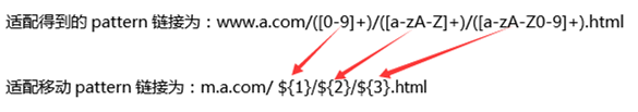 1、在360的移动适配规则中,移动端页面pattern对应PC端pattern中可替换参数的顺序,与其他的规则略有不同。在规则中,可替换参数在对应的PC页pattern中出现的顺序,依次用\1,\2,……表示该参数。如:http://www.xxx.com/cat/(\w+)/ http://m.xxx.com/cat/\1/。