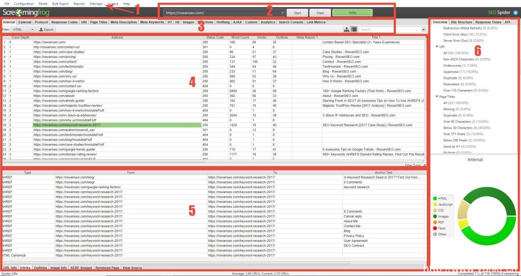 检查内部链接的快速简便方法是使用Screaming Frog。这是因为它通过内部链接抓取整个网站,因此收集了大量有关网站导航,锚文本和alt属性的数据。