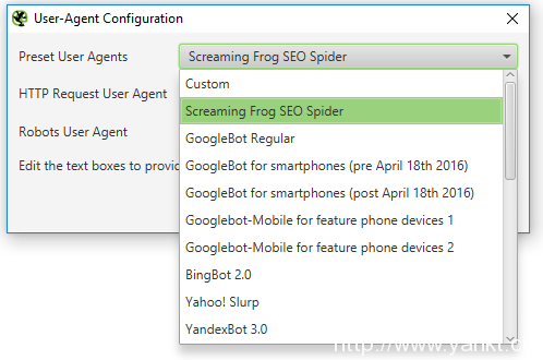 我很少需要做的就是更改我的用户代理以进行爬网。默认为Screaming Frog,但您可能希望以与Googlebot相同的方式查看网站。因此,更改用户代理有时会有所帮助。