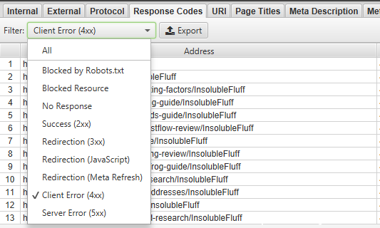 要查找损坏的链接,首先需要选择“响应代码”标签。然后选择显示客户端错误(4XX)的过滤器。