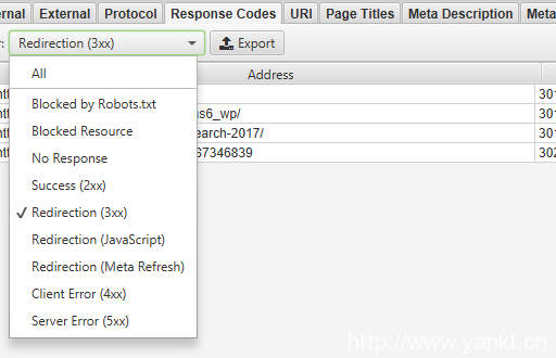 使用与上述相同的方法,选择显示重定向(3XX)的过滤器。这将为您提供所有内部重定向。