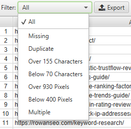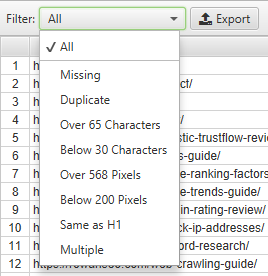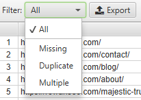 页面标题 – 您可以在此处快速访问您网站上的网页标题。如果您有超过1页的标题,它会这样说。此选项卡还具有用于查找重复,短,长和缺失标记的过滤器选项,以及用于检查标题是否与H1标记匹配的选项。