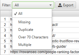 要开始使用,只需选择页面标题选项卡即可。然后,这将向您显示所有HTML页面和相应的标题。可以过滤此数据以显示具有缺失,重复,短,长和多个标题的页面。这将帮助您找到快速解决的问题。