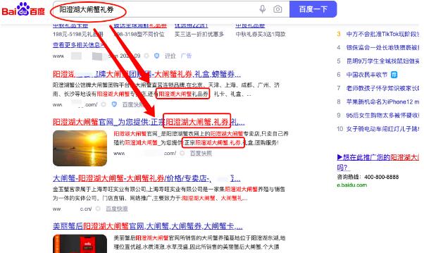 举例,比如,我搜索”阳澄湖大闸蟹礼券“这个关键词,那么我就是想了解下礼券,我们看看百度搜索结果如图,自然排名这些网站主题都是与大闸蟹礼券有关。