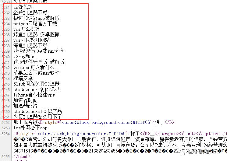 如果说上面两个干货是基于网站模板方面的原创度、上图中这些文字、就是基于内容方面的原创!随机插入相关文字、原PAGE只有200多行的HTML、大家从上图可以看到、文字加到了5000多行、从文字方面又对PAGE进行了原创。一个页面由HTML代码+文字组成、要想改变PAGE的原创度、从两个方面入手、这个作者也真是煞费苦心!许多人只看到了别人上排名、却看不到别人背后的努力!