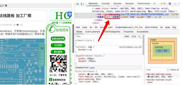 1.2、图片所在网页的周边有相关文字描述,以及图片做了alt标签属性。如上图,图片中加了ALT文字:线路板。查看源代码即如图: