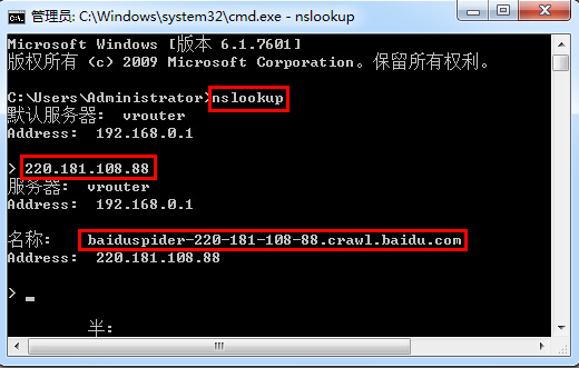 最后一步:直接输入IP地址,如果是百度的IP,会返回类似的结果:baiduspider-220-181-108-88.crawl.baidu.com