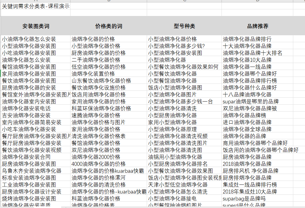 当我们获得大量的关键词数据后,我们经过筛选得到一些与自己的企业产品相关的关键词,去掉垃圾词,关键词词库表示例如下: