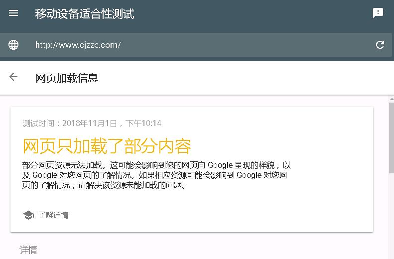 有时候,测试结果展示的屏幕截图并不正常,可能是测试无法加载相应网页所用的所有资源,会显示“网页包含无法加载的资源”的警告消息,这些资源是指网页包含的外部元素,如图片、CSS 或脚本文件。导致出现该问题的最主要原因可能是网站站长设置robots.txt禁止搜索引擎访问相应资源,只需修改robots.txt,取消禁止搜索引擎访问此资源即可。