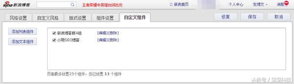 具体的做法,把链接做成锚文本的形式,就是用上述的“昵称”作为关键词就行,然后把它们放到表格中,随机打乱,分成数量不一的不同小组。然后将这若干的新浪博客小组群随机添加一组到单个新浪博客上面,具体的步骤是:点击新浪博客页面设置,然后直接添加文本组件就可以了,如下图:
