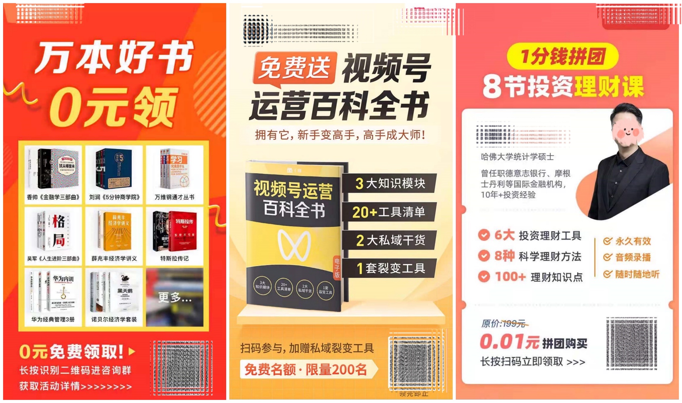 另一种就是商家玩的比较多的免费领取资料裂变海报玩法,制作一张用于朋友圈裂变的海报,然后引导你扫码加微信,需要多少个好友为你助力能获得资料并拉你进群之类的。