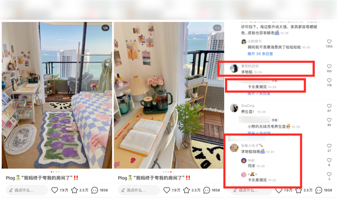 评论区是重点,会发现这评论区问的求地毯链接,然后博主就回复什么品牌,也有求养生壶链接,博主有说这是小熊偏僻。分不清它是在推地毯还是推养生活,有可能是真实的种草,所以的话我们就能够知道一篇报文出来,它背后一定是有原因跟逻辑的。