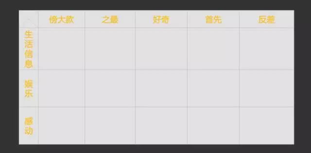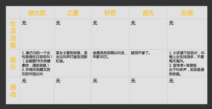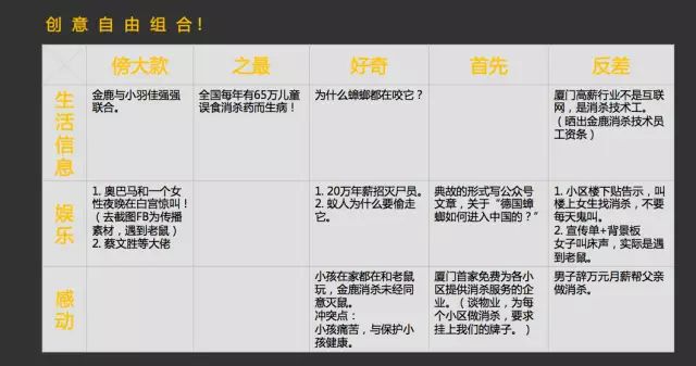 我们找到了创意集中点“尖叫”,那么我们围绕“尖叫”用你的脑洞把第二步的表格填满,创意事件就出来了。