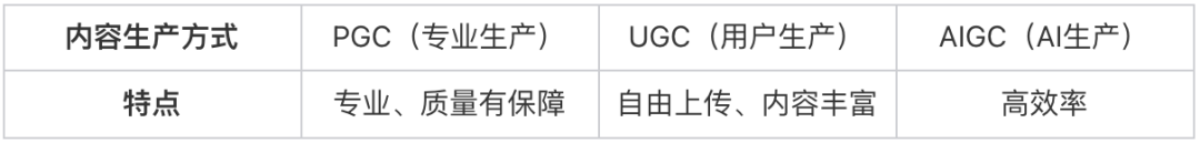 我们正在经历着 AIGC 互联网d时代。内容生产方式经历了由 PGC—>UGC—>AIGC 的过程。现在,我们可以利用人工智能自动生成文字、图片、音频、视频,甚至3D模型和代码。