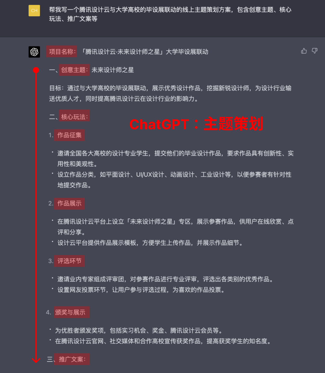 同样可以利用 ChatGPT 进行主题策划。告诉它你的需求,要求它给出主题、玩法、推广文案等。ChatGPT 可以帮助我们快速梳理活动流程,但在创意性上任需要我们多费心。