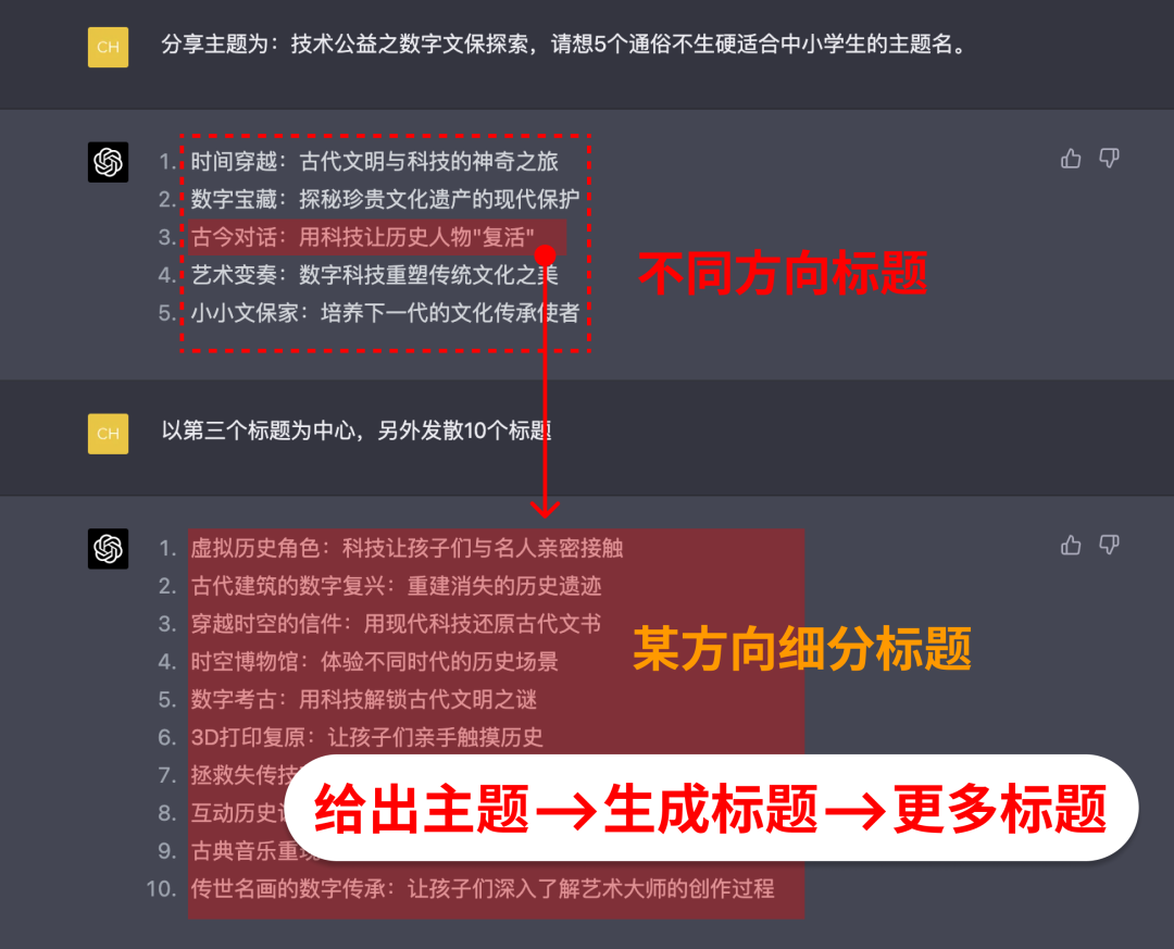 在完成了提纲和正文写作后,我们需要给文章一个合适的标题。这部分工作也可以交由 ChatGPT 完成。它会通过分析文章的核心观点和关键词,提供更多匹配的文章标题。拿到它的标题后,我们可以选定其中某个方向的标题,让 ChatGPT 再进行无限发散,从中选择最符合需求的标题。