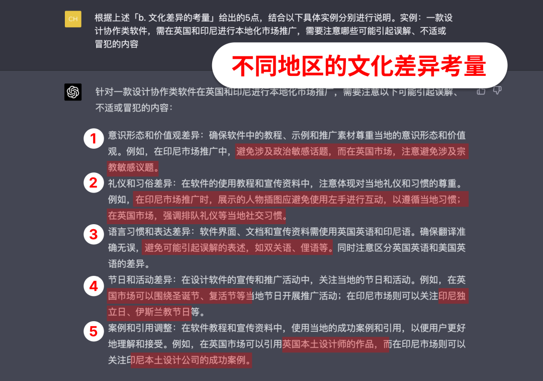 在面临一些海外项目时,内容运营需关注不同海外市场的文化背景,才能尽量避免触及敏感话题或生成引起误解的内容。在文化差异、语言使用、礼仪习惯、案例引用等方面,ChatGPT 是一个非常得力的百科小助手,帮助我们了解目标市场的文化背景,从而更好地调整内容策略。