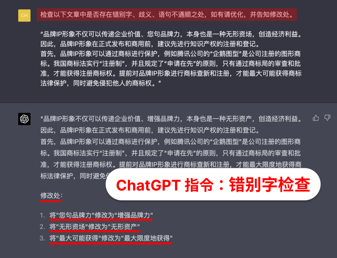 当我们拿到一段文案的时候,同样也可以反向让 ChatGPT 充当语文老师角色,帮助我们优化文本内容,提升写作质量。尤其是长文案,人工审核难免出现遗漏,利用 ChatGPT 可以帮助我们多做一层基础校对,发现并纠正错误,让文字整体更专业易读。