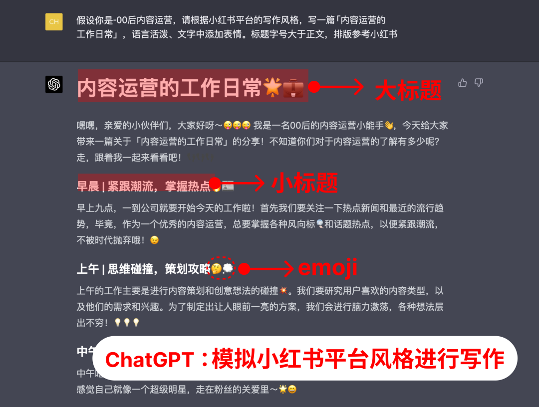 我们输入明确的指令,如:“生产一篇适合在小红书上发布的文章”,ChatGPT会根据平台特性生成符合相应平台风格的内容。还可以要求生成带有特定元素的标题,如疑问句、数字、情感词等,来提高文章的吸引力和传播力。