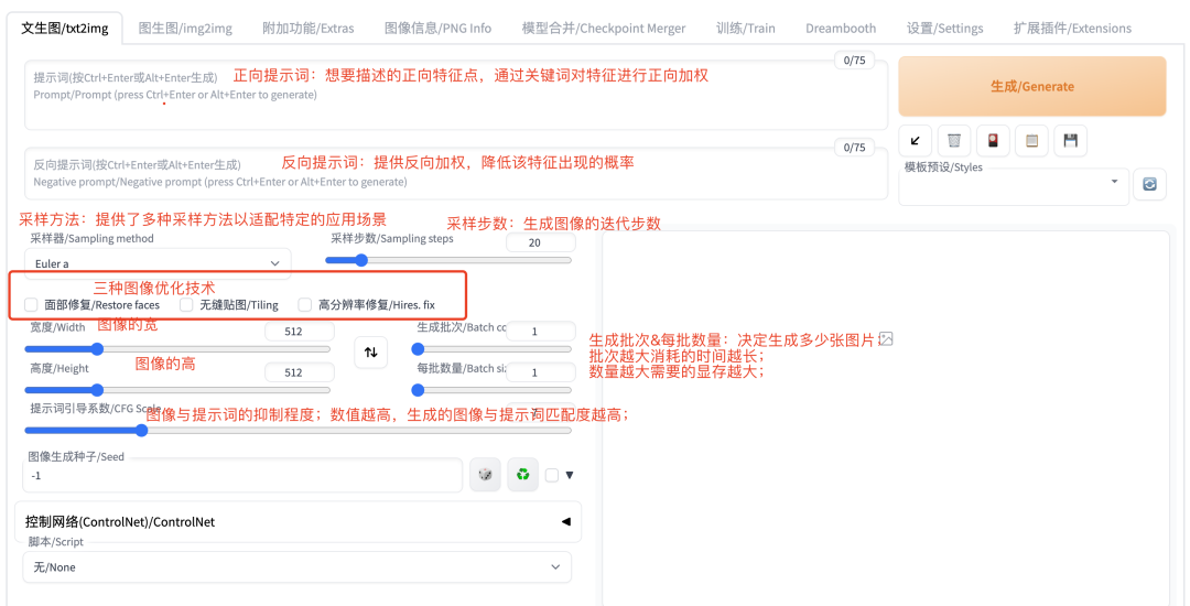 SD核心的几个功能:文生图(txt2img)、图生图(img2img)、模型训练。