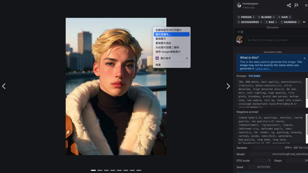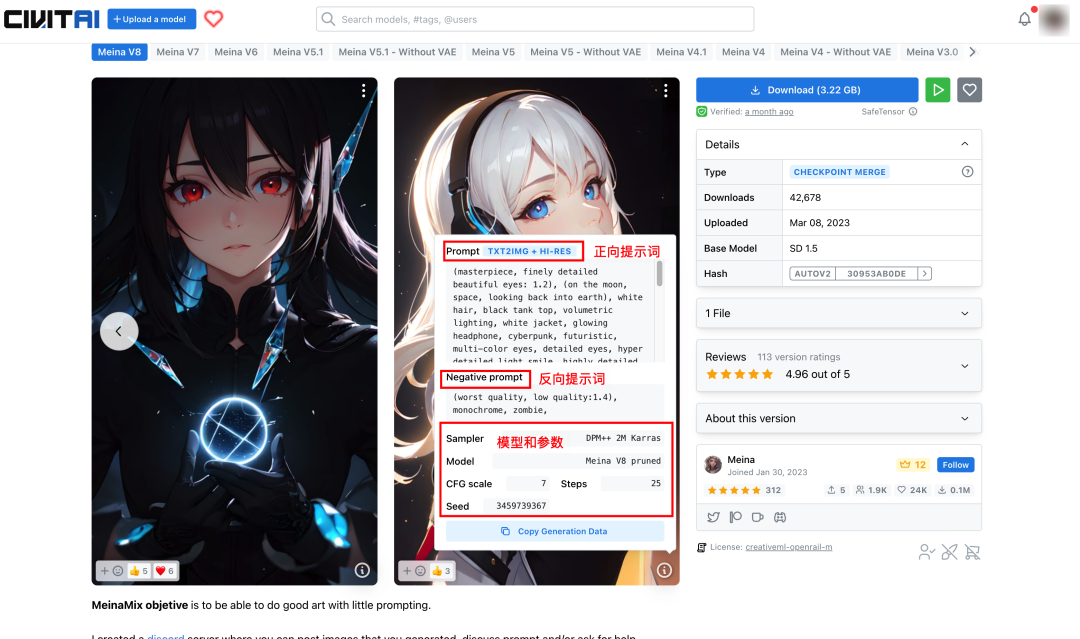 我们可以在模型分享社区C站上参考大师们上传作品的提示词、参数和seed,方便我们快速尝试类似风格的效果,进行训练。