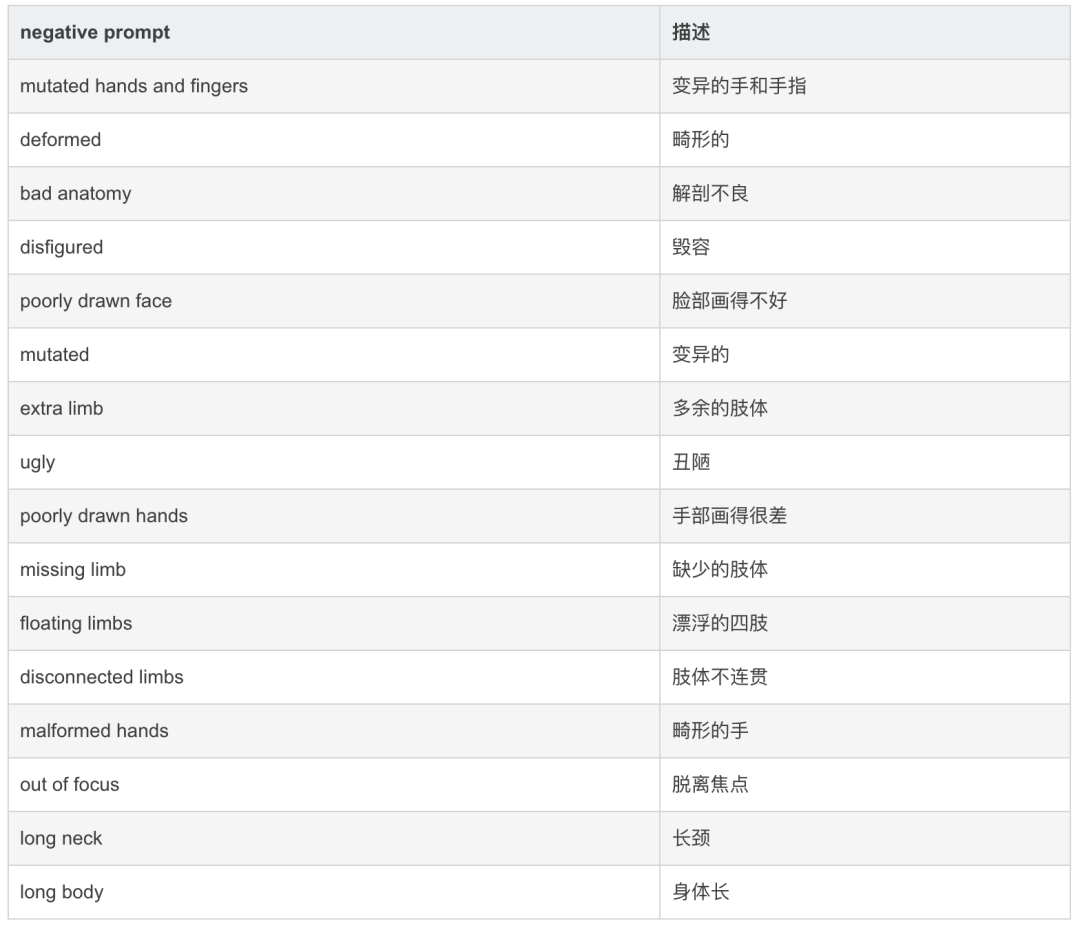 输入反向提示词,表示不希望图像中出现的内容,如:mutated hands and fingers,deformed , bad anatomy, disfigured, poorly drawn face, mutated, extra limb, ugly, poorly drawn hands,missing limb ,floating limbs , disconnected limbs,malformed hands , out of focus, long neck, long body…