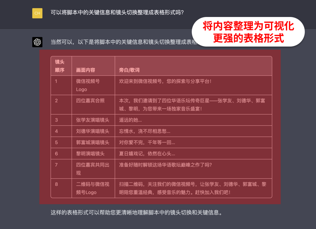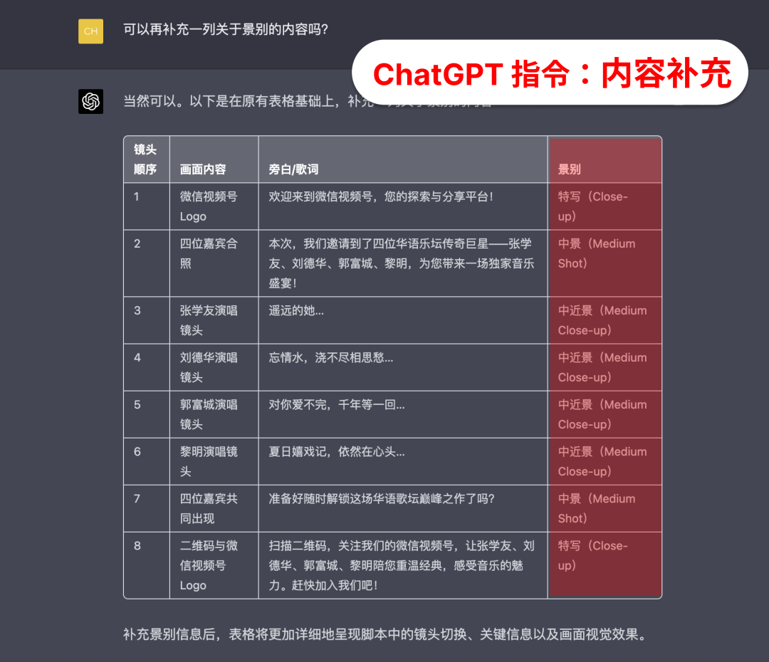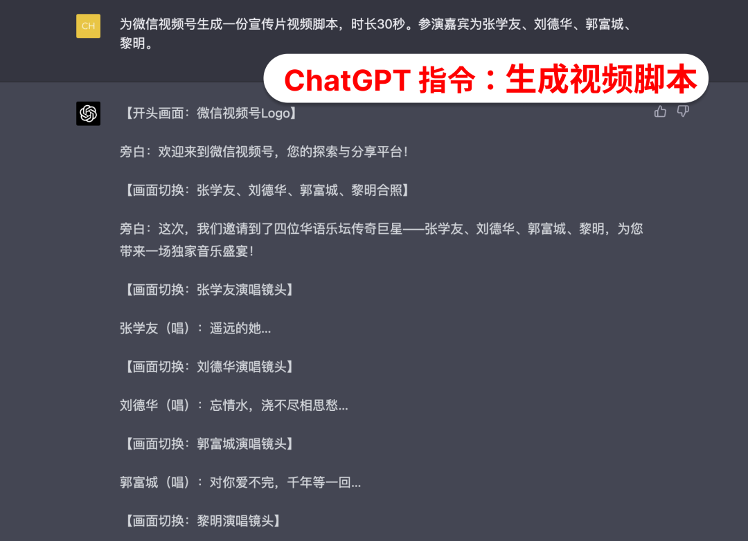 把你想写的选题告诉 ChatGPT , 数十秒时间它就能生成一条完整的视频脚本,包括了具体场景和转场画面。虽然在创意上依旧乏善可陈,但利用 ChatGPT 编写新闻,提高内容制作效率,在非专业人士入手视频创作来说,还是有一定帮助的。