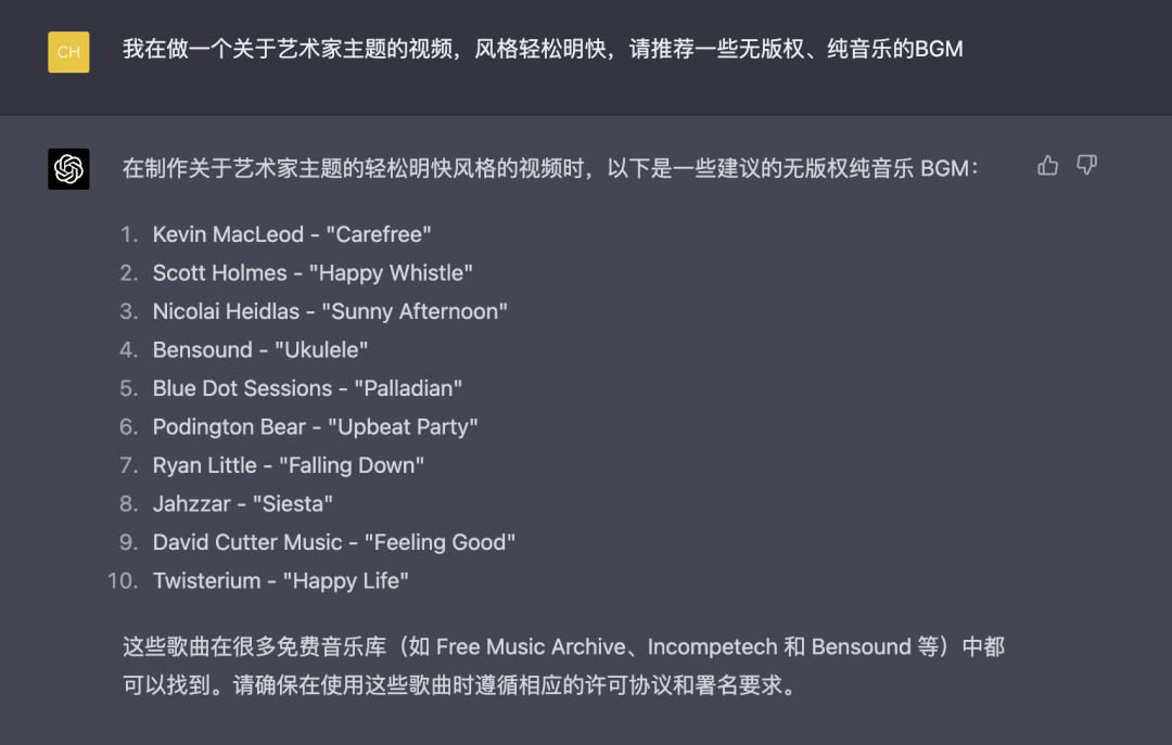 视频制作的时候,为视频挑选上一首合适的BGM,是奠定视频情绪是关键的一环。ChatGPT 能在海量背景音乐中为你筛选从而节省时间。需要告诉它你的视频是什么情绪,它会立刻给出明确参考建议。