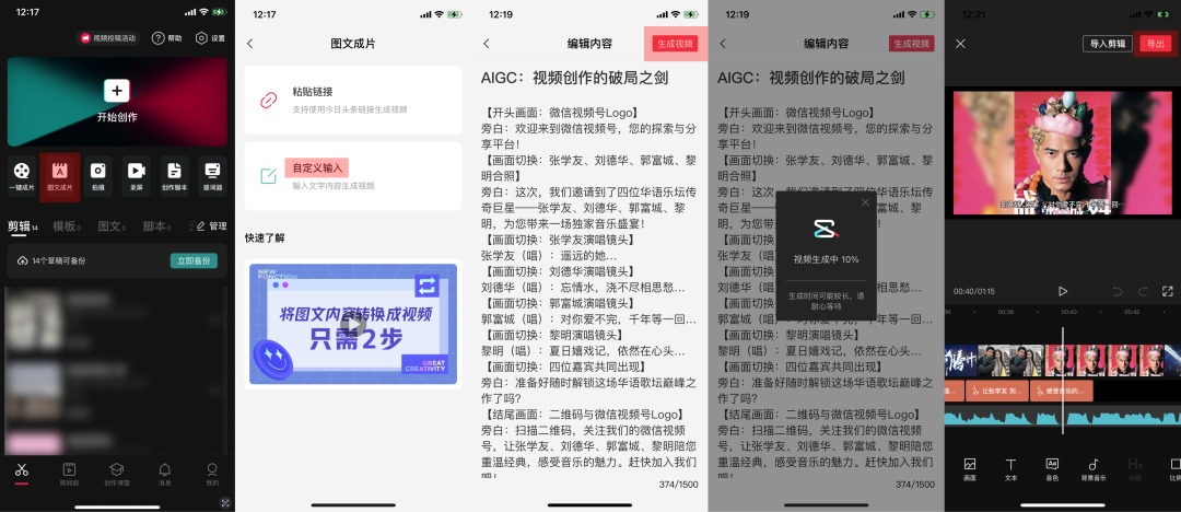通过ChatGPT生成文案,将这些文案复制到支持AI文字转视频的工具内,从而实现短视频的自动生成。市面上一些手机剪辑软件也支持文字转视频,系统匹配的素材不符合要求时可以手动替换。