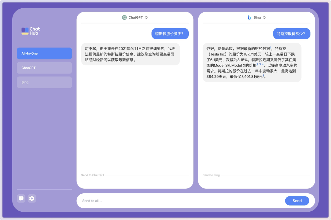 如果想对比 ChatGPT和New Bing 的答案怎么办?可以借助第三方插件 ChatHub,直观对比出 ChatGPT 与 New Bing 两款应用的搜索结果,方便运营同学取舍结果。