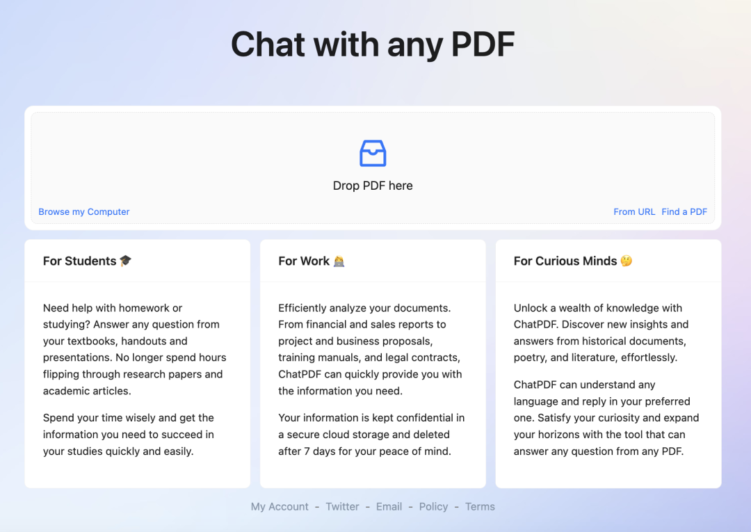 借用网站ChatPDF,可以把我们从时间中解救出来。上传PDF版本的文献,便能在极短时间内帮助总结文献,我们也可以针对文献内容进行提问。