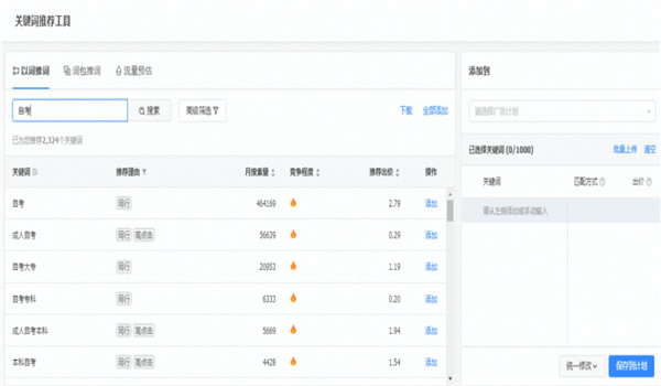 以学历教育行业为例,图中为巨量后台的关键词推荐工具,我们可以在搜索框里搜索“自考”、“成考”、“夜大”等词,然后就可以找到很多词。