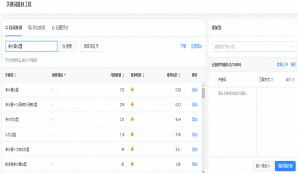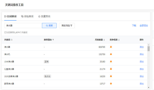 打开关键词推荐工具,搜索“净水器”,通过图中可知,搜索量大的词主要是通用词,另外“小米净水器”、“沁园净水器”这两个属于竞品词(竞品词是一个相对概念,是相对于自己而言对方是竞品。如果本身叫xx净水器,那么这个xx就叫做品牌词)。搜索出结果后,我们把这些词都下载出来。