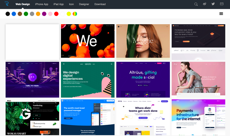 这个网站通过颜色的分类来进行检索,提供手机App、iPad App、网页设计、icon设计的精彩案例。点击颜色就会出现以这个颜色为主的案例设计。不仅对于色彩搭配的学习,对于设计审美的提高也有很大帮助。