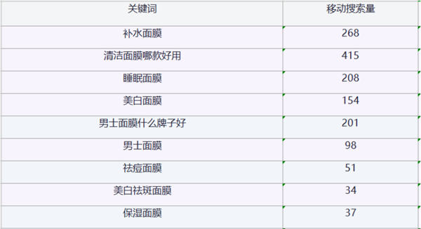 我们可以从数据中看到,消费者所关注面膜的功能性中有:补水、清洁、美白。而搜索量则代表着需求量的旺盛程度。在资源与精力有限的情况下我们可以通过数据来做出决策。比如对清洁感兴趣的消费者明显比祛痘的多,在宣传和文案上给我们指引了方向。