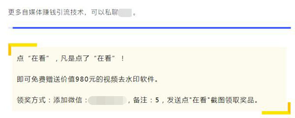 在文章开头固定一个长期的风格,随着各种节日或者应景的事件来进行微调,可以而每次只是换换不同主题的关键词,就拿公众号来说吧,可以在结尾这样写:“想了解更多自媒体赚钱引流技术,可以私聊XX。……”