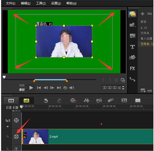 双击轨道2视频,然后点击小人头图标,然后选择色度键,调整颜色,把数值调到50+就行。