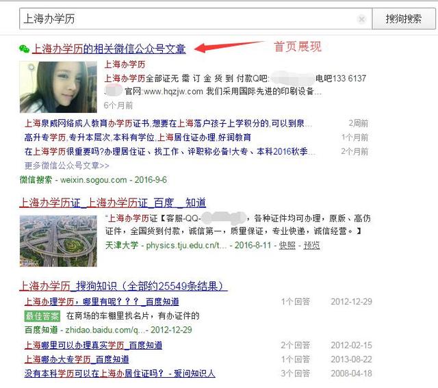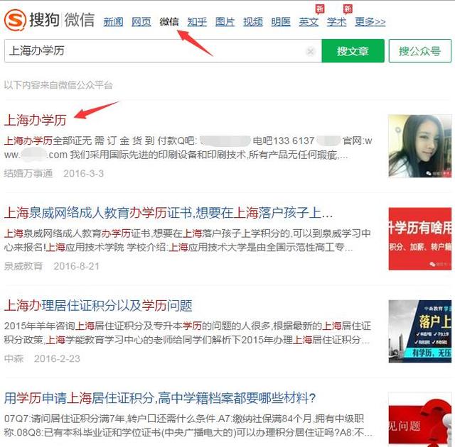搜狗搜索引擎里面有一项是别的搜索引擎没有的,那就是可以搜索微信公众号发布的内容,而且有时候还可能在网页展示,如下图