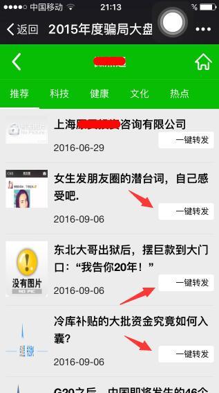 那么这个是怎么实现的呢?我们来简单分析一下,首先得建一个素材库(如下图),收集最新的热门文章,把每一篇文章加上一段JS代码,用这段代码实现浮窗广告的功能,剩下的就是转发、让别人转发,达到曝光目的。